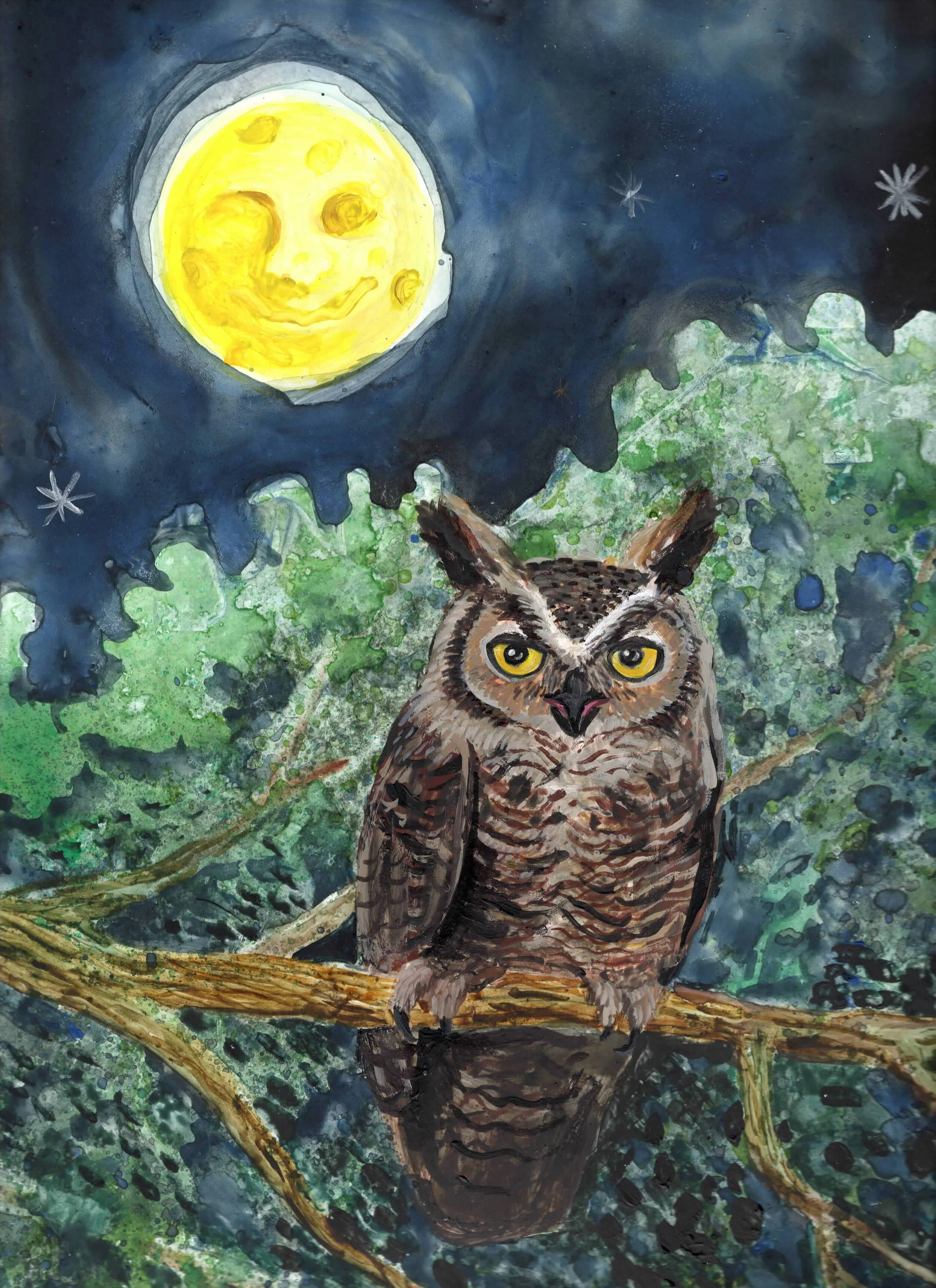Illustration for a children’s book I am writing, Great Horned Owl, WIP, mixed media on yupo, 2021